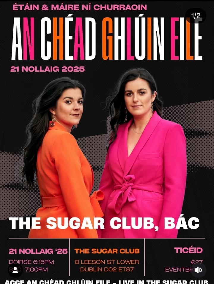 I went see An Chéad Ghlúin Eile for the first time in March at the Sugar Club in Dublin. From the Ráth Chairn Gaeltacht, An Chéad Ghlúin eile are sisters Étáin and Máire Ní Churraoin. I’d met Máire before, who performed brilliantly as Bean an Tí at Pobal Gaeilge 15’s show in Ongar, Dublin 15, in 2024. The gig at the Sugar Club was really enjoyable. If you haven’t seen them yet, you’re missing out!