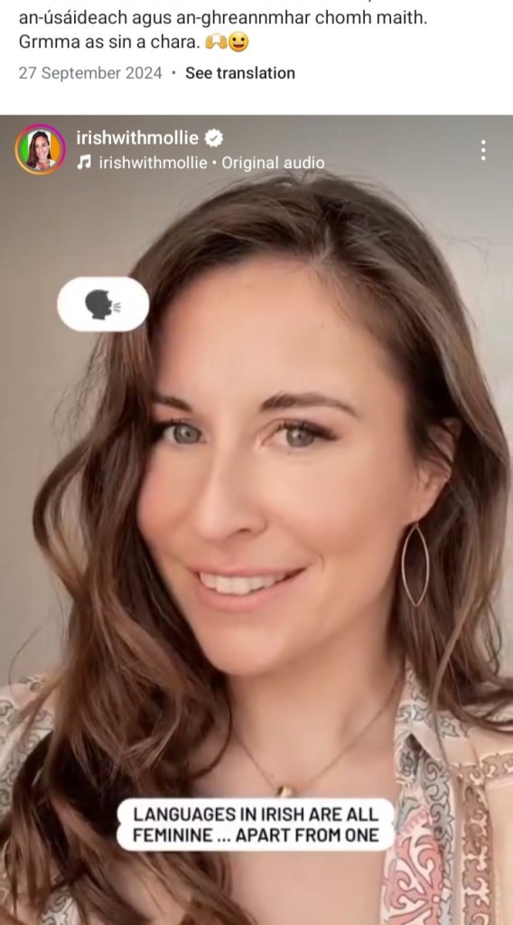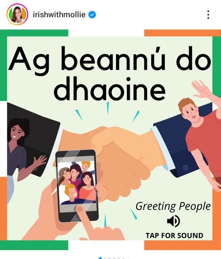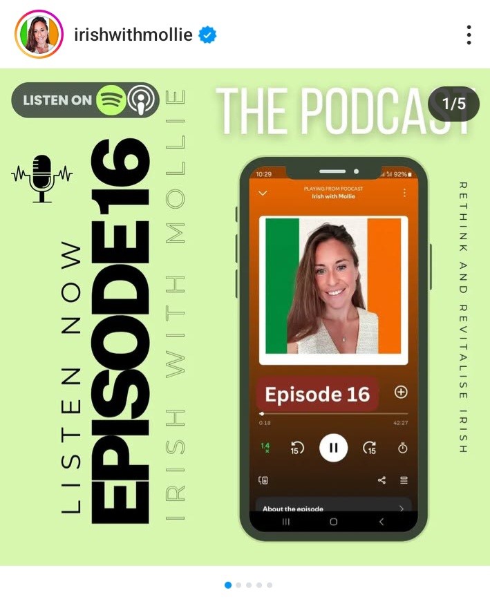 For 250,000 people on social media, Irish With Mollie will need no introduction. Mollie is an educator who has taught Irish and English and designed an online course that she believes is suitable for all kinds of learners. Mollie is a major presence on Instagram and TikTok and is a passionate believer in working towards a bilingual Ireland where there is greater equality for the Irish language.